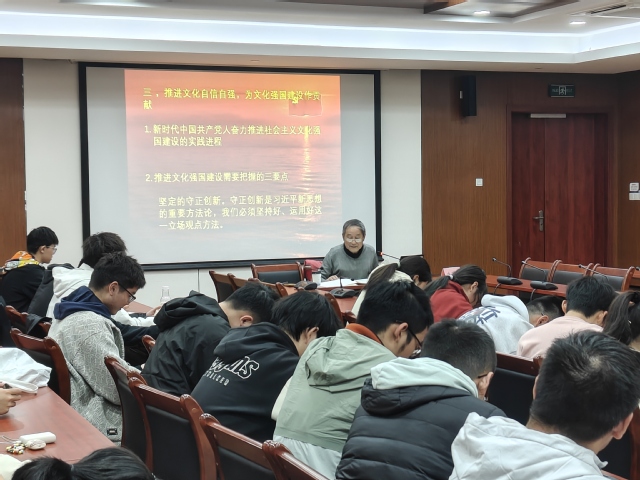 讲座伊始,庄民生教授结合自身多年思政教育工作经历,以“五老”视角解读党的二十大关于文化强国的战略部署。他指出“文化是民族的血脉,精神独立需以文化自信为基石”,庄教授从中华优秀传统文化、革命文化、社会主义先进文化出发,以史为据,层层剖析文化自信的历史逻辑,生动阐释了坚定文化自信的精神内核和对青年成长的深远意义。庄老师鼓励学生骨干从红色基因中汲取力量,将“小我”融入国家发展、民族复兴的“大我”,在服务同学中锤炼本领,在社会实践中厚植情怀。