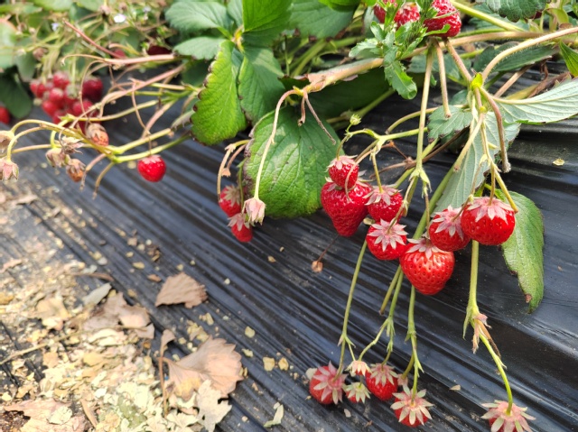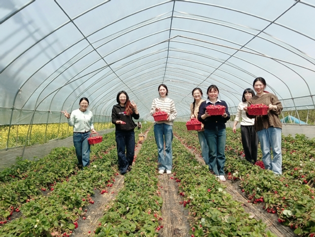 次日中午,草莓园里一派热火朝天的景象。平日里执掌教鞭的女教师们,此刻化身为勤劳的农技专家。她们俯身莓垄之间,手法娴熟地采摘、分拣、装筐,将专业教师特有的细致与严谨带入田间劳作。农场主连连称赞:老师们不仅教得好,干农活也是一把好手!仝晶晶老师边采摘边感慨:这既是一次助农实践,更是一堂生动的劳动教育课。