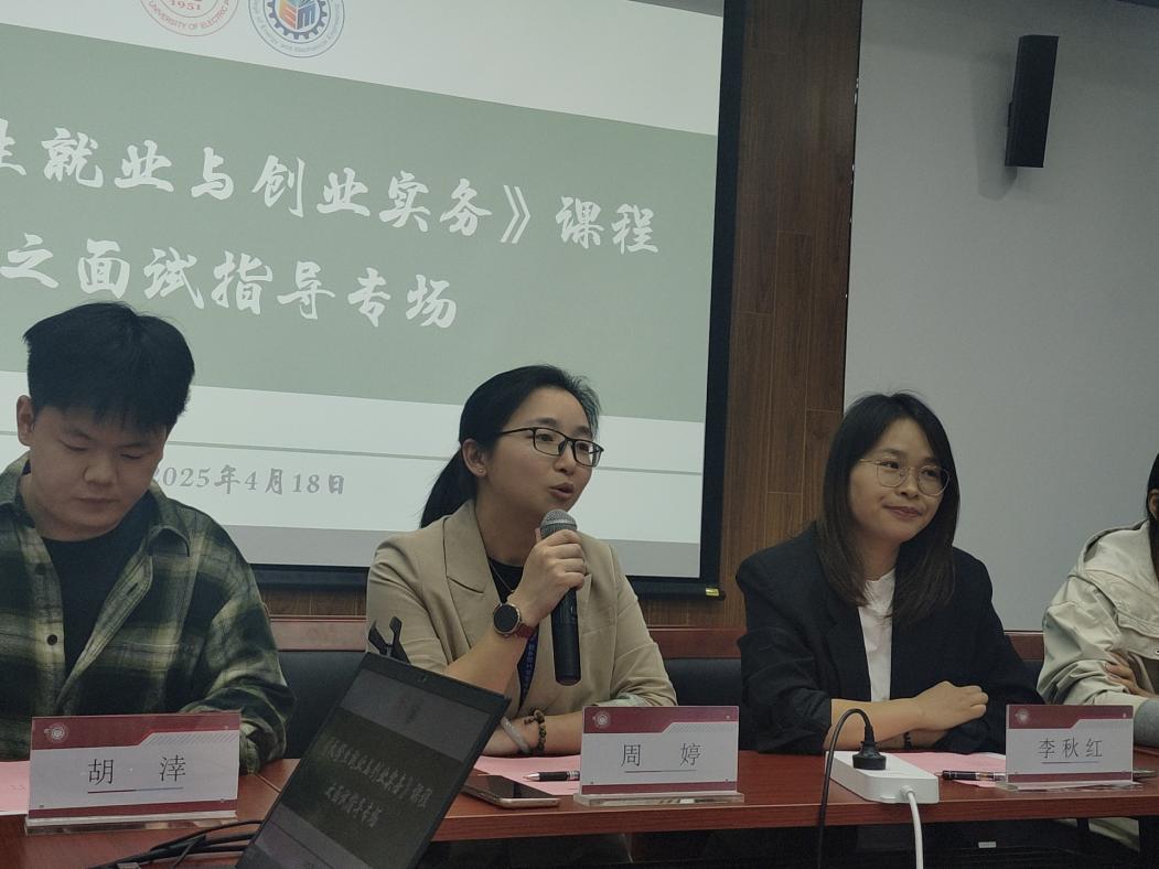 周婷在致辞中对两位校友嘉宾表示了热烈欢迎,指出本次面试指导专场活动是学院职业生涯教育和就业工作指导的重要环节,也是《大学生就业与创业实务》课程的主要模块。活动旨在通过"理论讲解+实战模拟"的创新型培养模式,为即将步入求职季的学生提供专业化、场景化的就业指导服务。