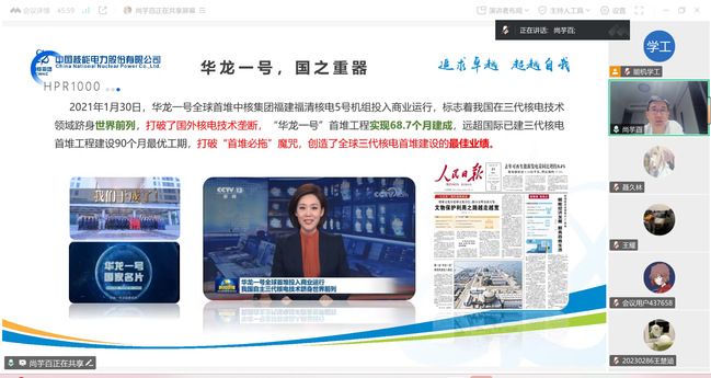 尚芋百对于同学们的精心准备和热情欢迎表示感谢,并表示非常高兴能够和同学们在云端相聚,和大家进行深入地沟通和交流。随后,尚芋百结合核电发展情况从行业前景、职业发展、人才需求等方面进行了详细的介绍。在行业层面,重点解读了“双碳”目标下核电行业目前的发展规划与市场机遇,深入分析了我国核电站分布和我国核电的竞争优势。在技术方面,通过“华龙一号”等典型案例,生动展示了核电和核电站运行原理等方面的知识。在职业发展环节,则详细介绍了人才培养体系,结合薪酬福利等实际要素,为同学们勾勒出清晰的成长路径。
