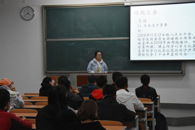 2018年11月20日星期二晚上8:20,WilliamHill官方网站新闻稿培训第二讲在三教210成功举行。此次培训由媒体工作部副部长周盈辛主讲,各班宣传委员及各部门干事参与了培训。
