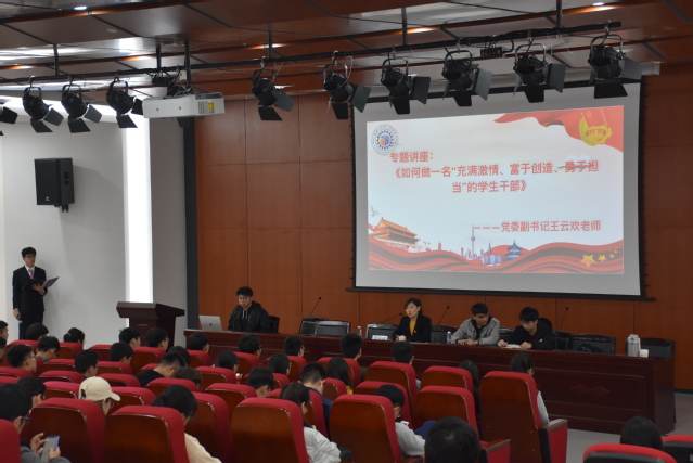 王老师首先介绍了本次讲座的目的是向各部门干事及班团干部分享做团学干部的心路历程以及要求。再具体开始介绍学生干部的作用:一是纽带,是在领导老师和所有学生之间的那条纽带,协助老师,做好上情下达,下情上报;二是镜子,起着映射的作用;三是窗户,通过此来挖掘自己的潜能;四是旗帜,永远走在最前端。其次介绍了对于学生干部的看法,这是一份特殊的职位,在学会在服务他人的过程中,锻炼自己,从而提升自己的能力。同时提出对于政治素养和心理素质的要求,尤其是要具备包含兴趣、丰富的情感、坚定的意志等业务能力,以及在奉献与荣耀,学习与工作,个人与集体中正确处理这些关系。另外提出对于基本技能的看法,不单单要具备专业知识和才干,更要具备可迁移的技能:分析解决问题的能力、执行能力、共同能力、时间管理能力、身体力行的领袖意识。