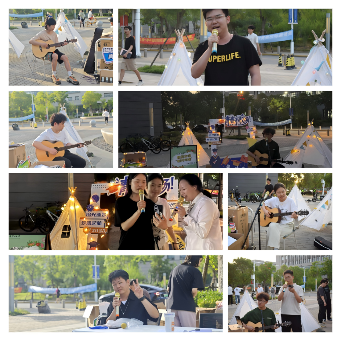 活动现场特别设置露天驻唱舞台,邀请毕业班学生张茂、张础岩、张亮及院十佳歌手张祉言倾情献唱。《一路向北》《凤凰花开的路口》《同桌的你》《那些年》《入海》等经典校园歌曲引发全场共鸣,摊位暖黄的串灯与往来人影交织成画,婉转歌声中,有人低声跟唱,有人举灯轻晃,点点光影摇曳如星河倾泻。更有即兴加入的“观众点歌”环节,泰国留学四姐妹以一首《Body Shaming》唱出“打破偏见,拥抱自我”的宣言,掀起一场关于自信与勇气的声浪,将夏夜的热烈氛围推向高潮。