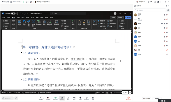 调研团队结合国家“双碳”战略,通过企业招聘数据、行业政策分析及个人能力评估,系统梳理了能源电力领域对高学历人才的需求,并量化对比了本科与硕士就业差异。黄兆铤同学详细介绍了调研框架与初步发现,王艺焜等同学则补充说明了信息来源与院校取样原则。