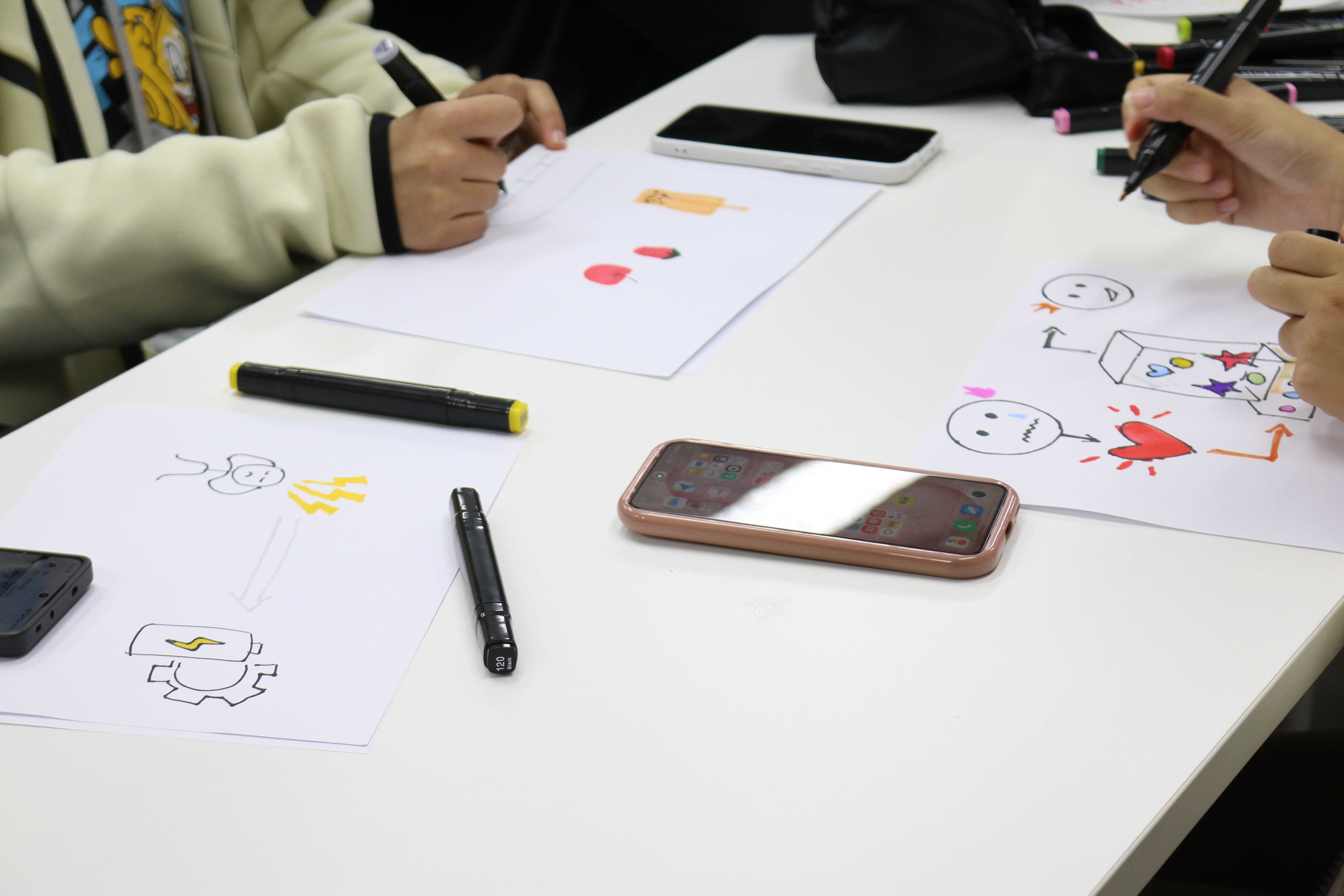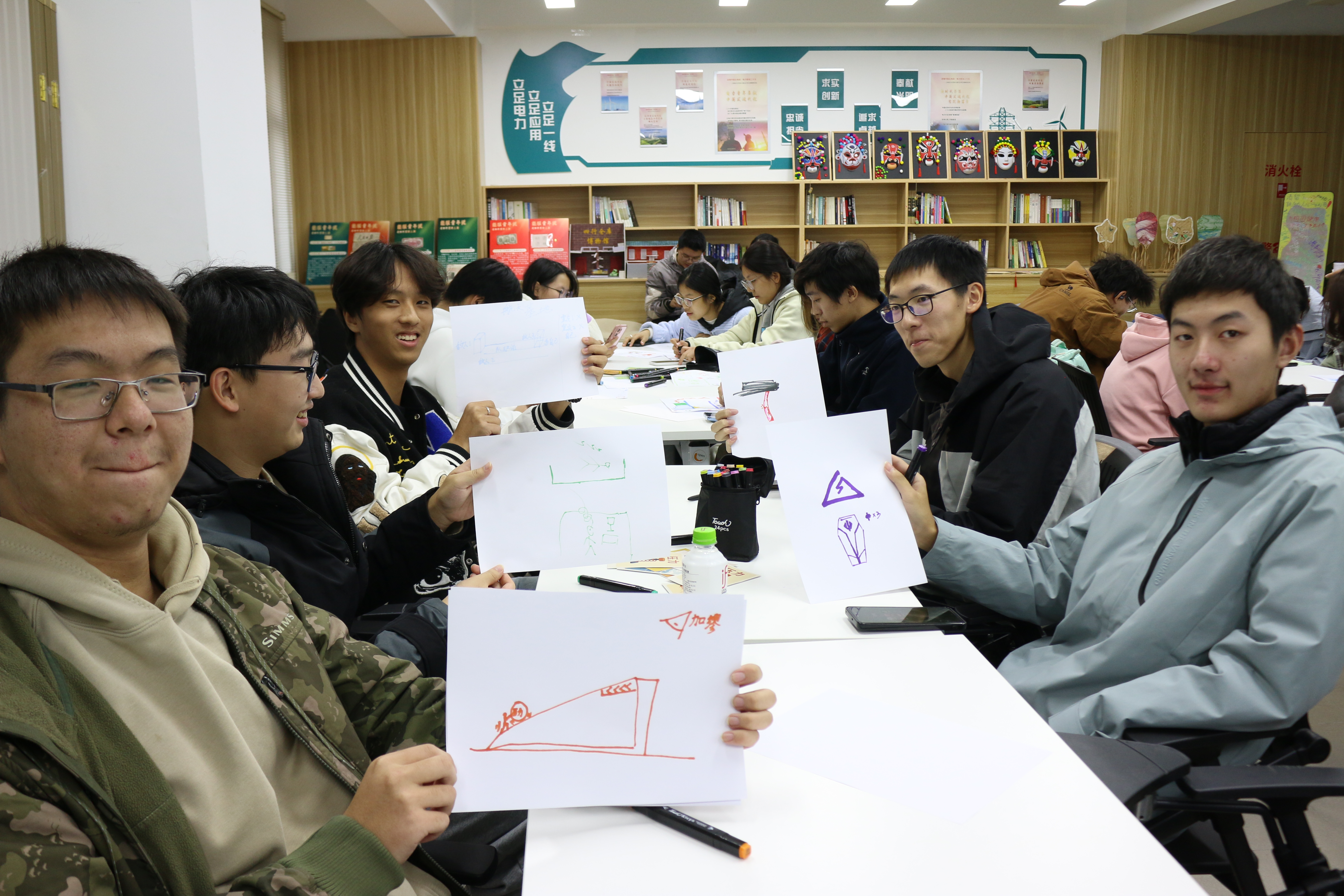 “能量创变”环节下各小组围绕组员们的压力场景,结合情绪卡片,以绘画形式设计“情绪能量转化装置”。同学们化身“情绪工程师”,笔下的创意装置既充满想象力,又紧扣能源机械原理,切实地为自己和同伴构思出个性化的解压方案。
