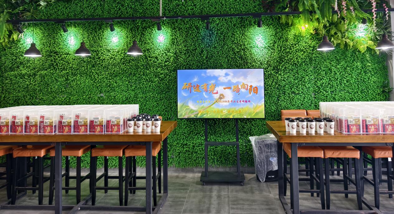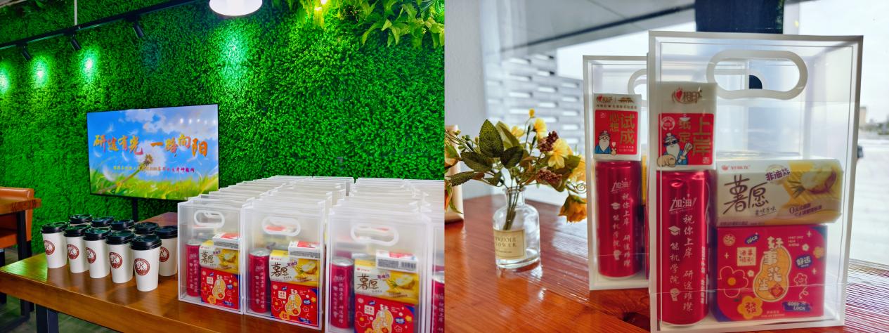 随后,学院为每位学子送上定制“考研能量礼包”:印刻专属祝福的可乐、寓意“好事发生”的花生、承载“得偿所愿”的薯愿、象征“纸定高分”的定制文具,搭配“温暖护航”的暖贴,每样物品都饱含学院的美好期许。活动现场特设“上岸咖啡”专区,以贴心细节为学子加油鼓劲,让大家在紧张备考中深切感受学院温情。
