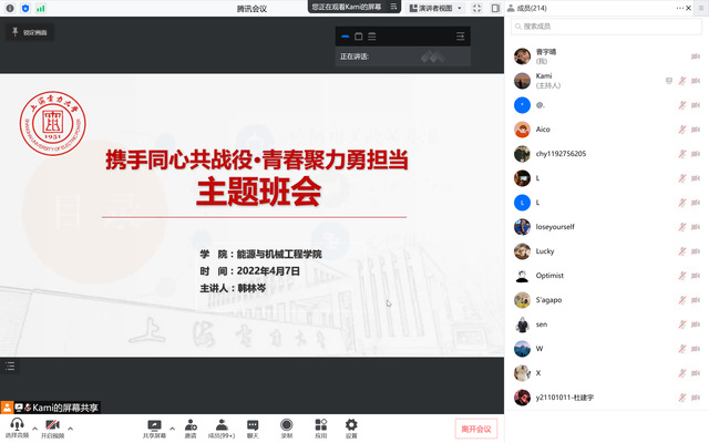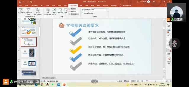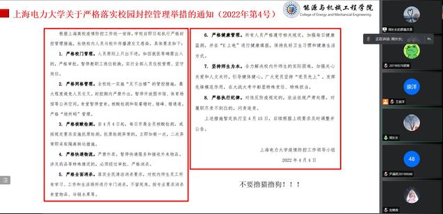 同时,为进一步激发广大青年学生在疫情中主动担当作为,各班班会还适时融入了校内外志愿者战疫事迹分享。其中,辅导员杨丽媛、仝晶晶、张财亮各邀请了冯志炜、邓凯、张宇琪、姚宇海、陆烨洋等同学线上分享自身的志愿故事,以志愿者的视角讲述了自身的抗疫经历和自身体会,使班级学生切实体会到志愿者的不易与艰辛。为增强配合学校疫情防控的主动性、自觉性意识,研究生辅导员韩林岑特地邀请了杨浦校区学生,分享了他们在“7+7”封闭管理期间的特殊经历,真正让广大同学体会到了目前校园能够安稳正常运行的来之不易。