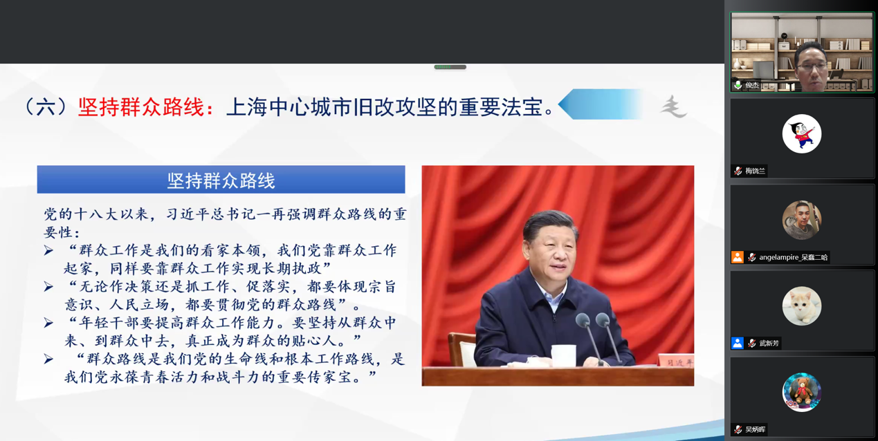 宝兴里等地区的旧改的经验,揭示了“再难也要想办法解决”、“抓住人民最关心、最直接、最现实的利益问题”等理念,蒋教授由此谈及了伟大建党精神以及“人民城市人民建,人民城市为人民”的人民城市理念,并指出旧改经验的普遍应用意义对党员开展攻坚克难工作的指导作用。
