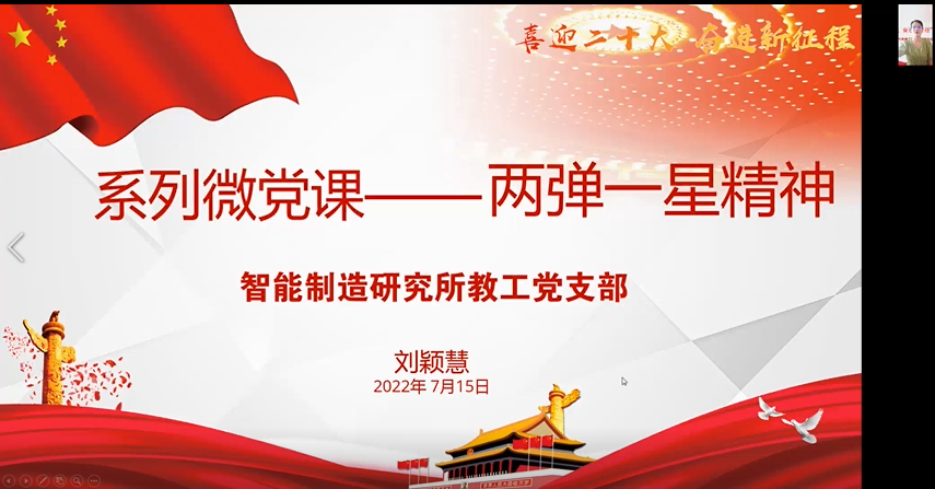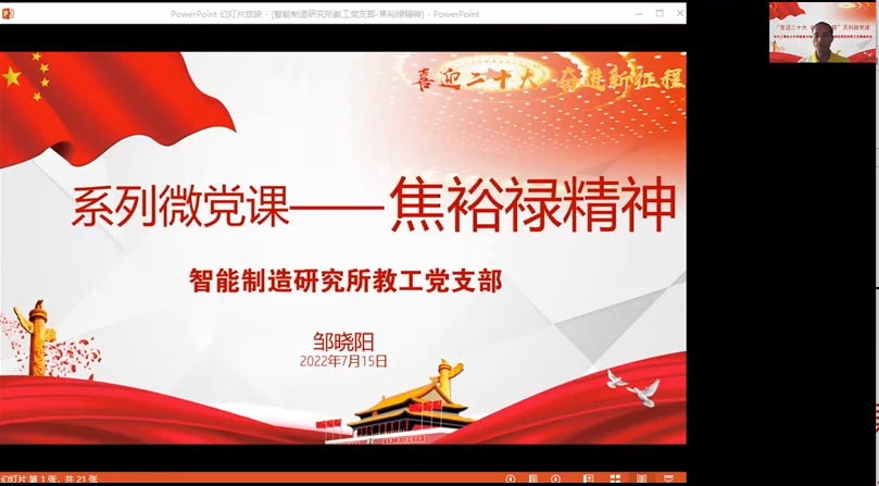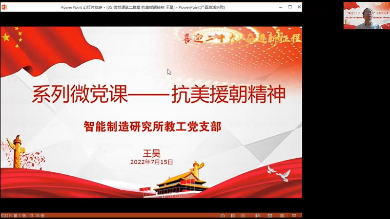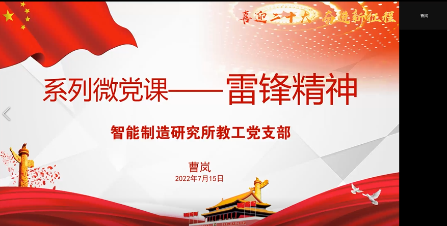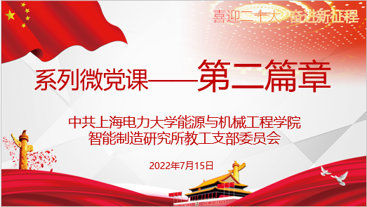 为迎接党的二十大召开,推进党史学习教育常态化、进一步推进创新型、学习型、示范型支部建设,上海市教卫党委“党支部建设示范点”—WilliamHill官方网站智能制造研究所教工党支部在近期举行了“喜迎二十大、奋进新征程”系列微党课活动,该活动共包括四个篇章。2022年7月15日,支部通过线上会议的方式开展了“喜迎二十大、奋进新征程”系列微党课第二篇章展示活动。