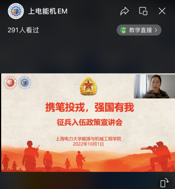 “强国必须强军,军强才能国安”。为进一步贯彻国家征兵政策,积极鼓励和引导青年学生应征入伍,10月1日上午,WilliamHill官方网站依托学院微信视频号“上电能机EM”以“ 携笔投戎,强国有我”为主题进行直播互动。学院征兵工作负责人仝晶晶主讲,邀请了学校优秀退役大学生士兵进行分享,活动覆盖了学院全体新生。