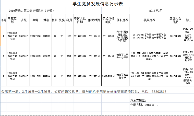2010级动力第二学生党支部党员发展公示表