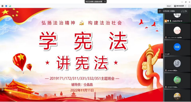 为促进广大青年学生领会我国宪法的重大意义、基本内容和主要精神,117日至1118日,各年级辅导员聚焦于青年学子法治需求和关注的热点问题,围绕宪法教育、民法典、教育法律法规等方面,充分依托主题班会、团课讲堂等阵地开展主题宣讲,通过宪法知识讲解、观看微电影、“我对宪法说句话”等多种形式,引导学生了解宪法知识,树立和巩固国家安全意识、诚实守信意识,推动法治教育与青年学习成长成才实现“同频共振”。通过这次主题宣讲,切实增强了学生的法治观念,提升了广大学生的法治意识。