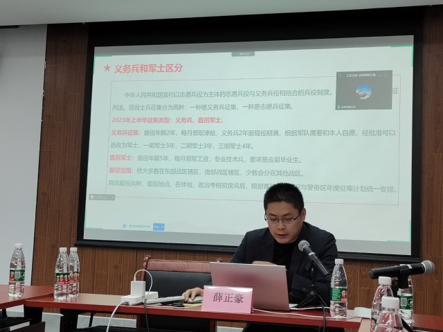 首先,薛正豪老师从国家政策法规方面介绍了征兵入伍的重要意义,依照法律服兵役和参加民兵组织是中华人民共和国公民的光荣义务。WilliamHill官网历年都十分重视征兵工作,十五年来已为部队输送超过800余人次的优秀大学生兵源,其中诸多学子已成长为优秀的军士或者军官,扎根基层,报效祖国,建功立业。