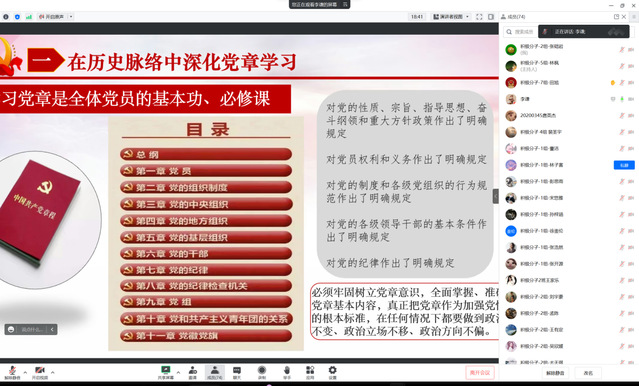 下午13时至1430分是入党积极分子专场,由李谦老师作了题为《党章历史沿革与百年大党成功之道》的讲座。李老师从历史脉络中深化党章学习、党章的起源与发展、百年大党成功之道的党章史解答、尊崇党章做忠实的践行者四个方面,向学员们们详细阐述党章的历程以及新修订党章的内容,通过深入学习和了解党章,进一步端正学员们的入党动机。