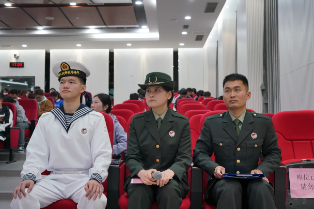 周婷在致词中表示非常有幸请到“南京路上好八连”来到学校与大家分享“霓虹灯下的哨兵”的故事,希望大家能在分享中感悟到好八连跨越时代的精神魅力、坚守理想的精神伟力、艰苦奋斗的优良传统、规范严明的纪律作风,常怀报国之志,让青春在祖国最需要的地方绽放绚丽之花。同时感谢校武装部薛正豪老师和退伍学生代表的参加,能为大家带来最新的征兵入伍政策和要求,分享最生动的部队生活和军营感悟。