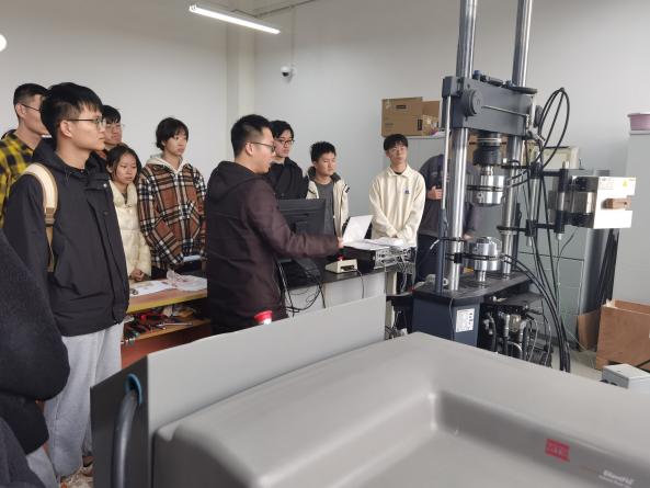 张世龙重点介绍了热疲劳实验室中MTS系统公司生产的多功能、高性能电伺服高温材料测试系统,并深入讲解了动力系统、冷却系统、试验系统和控制系统等四个组成部分、通过讲解,同学们对MTS材料试验机产生了浓厚的兴趣。