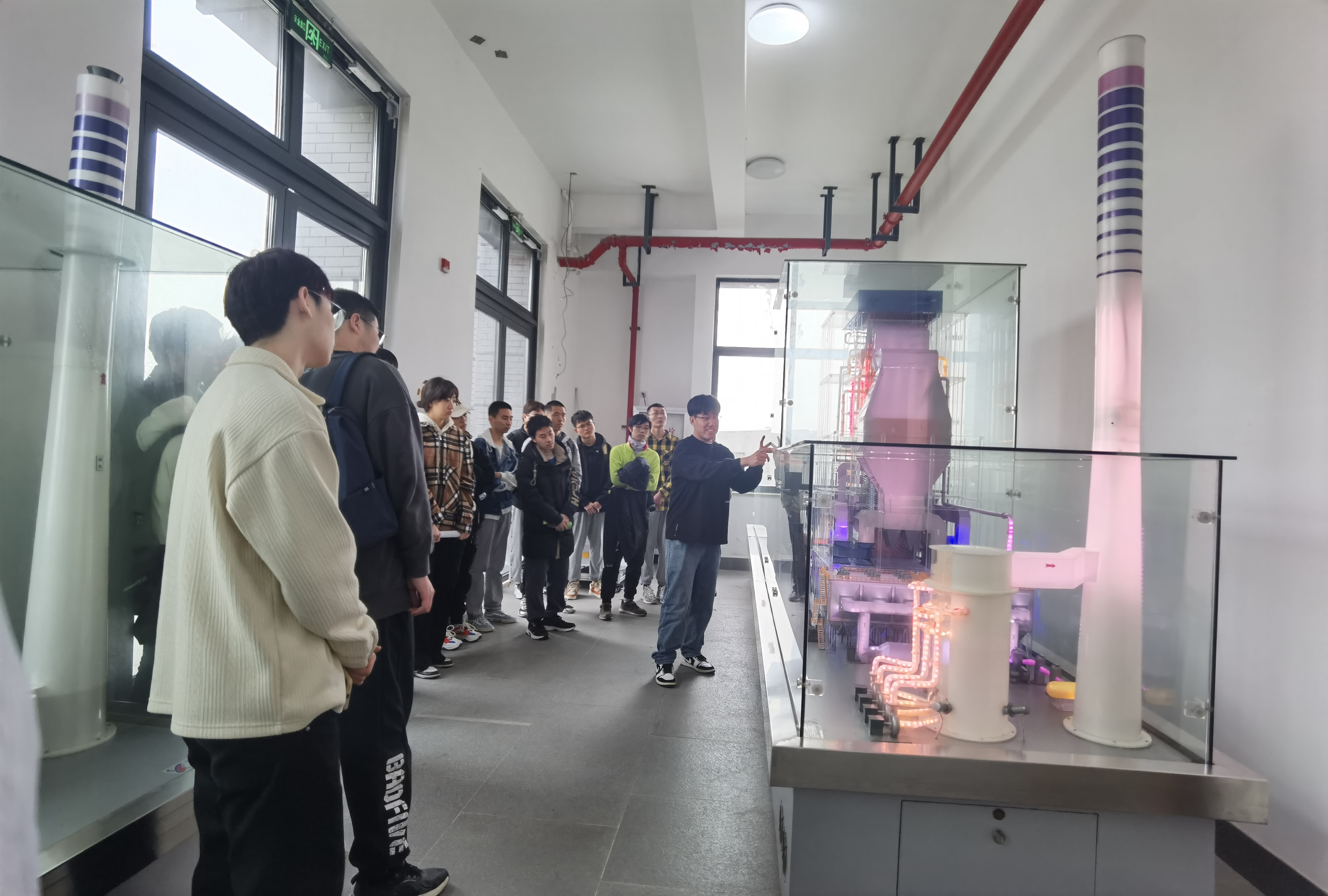 此次活动的讲解员由具有电厂工作经验的研究生或各实验室所属学科的研究生担任。研究生巨鹏涛、吕飞围绕1000兆瓦超临界燃煤发电机组模型生动讲解,巨鹏涛结合电厂工作经验详细讲解了锅炉设备及系统、汽轮机设备及系统、发电机及升压站系统等在发电厂的工作原理和具体流程。