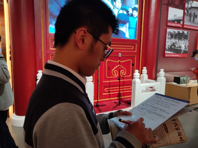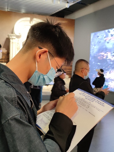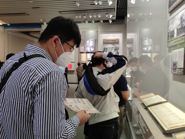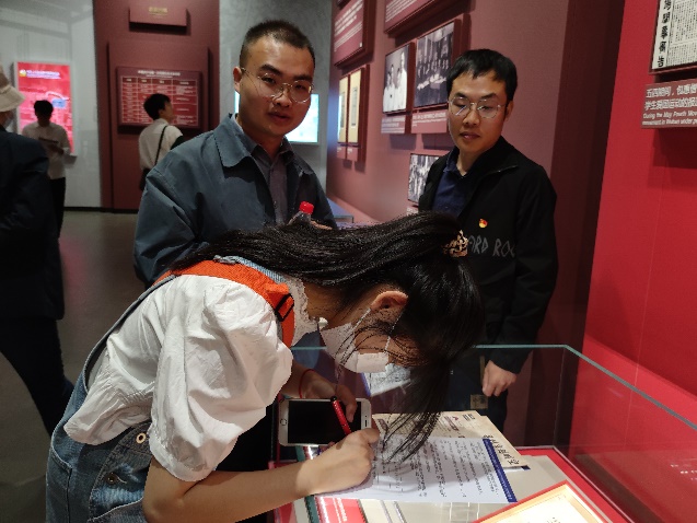 此次实地研学活动创新采取沉浸式互动学习方式,设置了合影打卡任务点、收集路人感言打卡任务、现场参观答题等。党员同志们边参观边找答案,并通过小组讨论,认真作答。