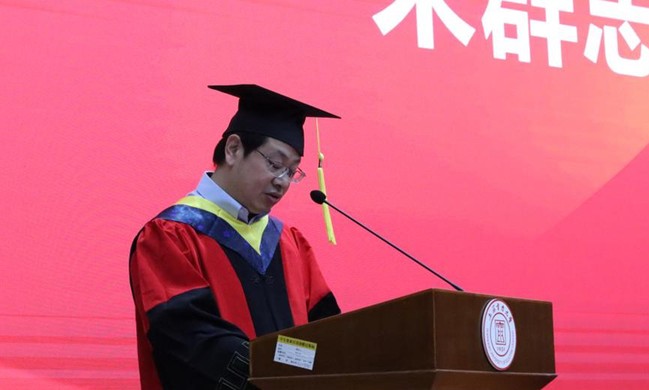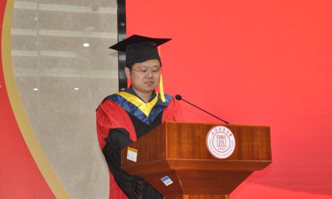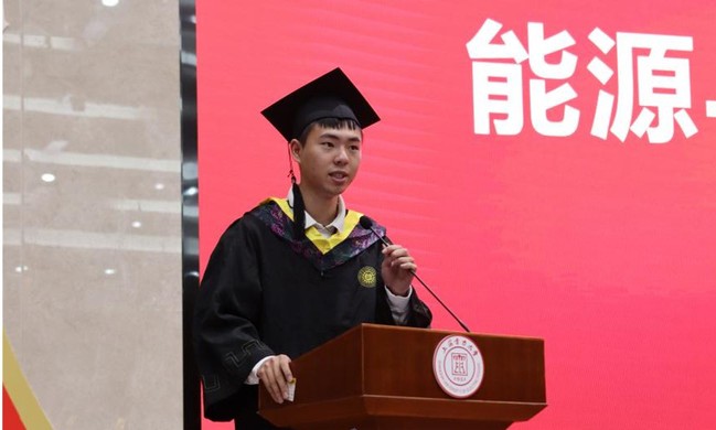 刘文扬作为学生代表发言。他回顾着在学校学习生活的点滴记忆,在教室里绘制工图;在图书馆里埋头苦读;在操场上奔跑;在湖畔散步……通过诉说青春和过往来表达对母校的感恩、不舍和依恋。他代表毕业生表态:要立志做无私奉献、锐意进取的追梦人,以奋斗有我、强国有我、功成有我的姿态,激荡起新时代的澎湃春潮。
