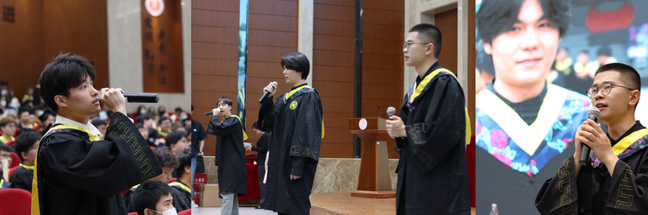 最后,典礼在毕业生代表带来毕业歌串烧中落下帷幕。一曲唱不尽离别,一曲道不完珍重,这一曲却可承载深深的情意,蕴藏浓浓的不舍,触动了一张张面庞,大家都随着音乐一起哼唱,欢欣抑或落泪。