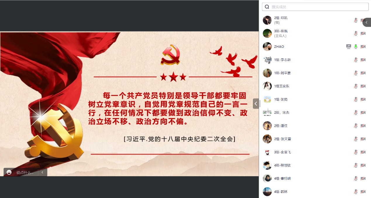 赵老师结合党的发展历程介绍了百年党章的发展。将党章的发展分为五个时期:革命时期的党章、社会主要建设时期的四部党章、改革开放以来的七部党章、新时代的党章及其意义、党的二十大对党章的修改。从党章不断发展的角度讲解了中国共产党的独特优势。一是高度重视理论指导,善于进行理论创新;二是坚持马克思主义政党旗帜鲜明讲政治的根本要求并形成独特政治优势;三是坚守以严密组织性和严明纪律性的党中央集中统一领导;四是形成中国共产党坚强领导的制度优势。