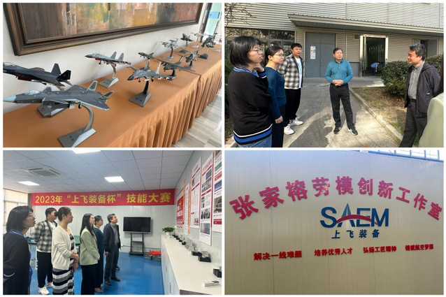 会后,在张家榕的带领下一行人参观了公司车间以及张家榕劳模创新工作室。近距离观摩国产大飞机的部段件生产现场和大飞机零部件、各类工装型架,通过对生产下料、机械加工、装配制造等工序的参观。参观中,双方就校企双方在人才培养和技术研发等方面的合作方向和具体实施举措展开探讨并达成高度的一致。