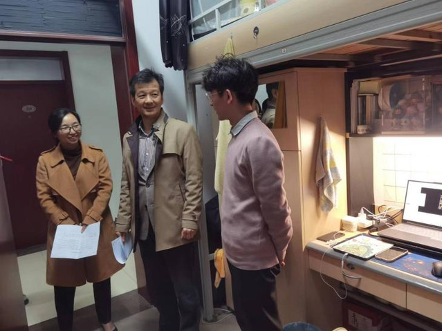潘卫国前往党员宿舍与学生党员们亲切交谈,他强调:一名党员就是一面旗帜,“党员宿舍”不仅是荣誉,更是激励。学生党员要强化角色意识,营造“安全、文明、和谐、向上”的宿舍氛围,时刻以党员的表征严格要求自己,以实际行动促进文明宿舍创建,促进学院党风和学风建设,积极帮助身边同学,主动接受同学们的监督,切实发挥好新时代高校学生党员的先锋模范作用。周婷表示“党员宿舍”挂牌是学院党委对每位党员的期待,更是党员同志的责任与担当,希望同学们在日常生活中敢于亮身份、做表率。