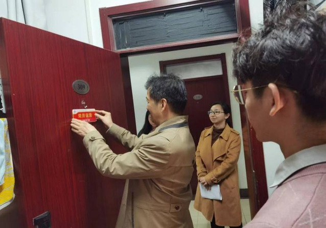 在活动中,潘卫国逐一郑重地将标牌贴到每个党员宿舍门上,“党员宿舍”的标志牌以红色为底色,融入学院徽章,象征着学院对党员宿舍的期待和要求,也激励着挂牌的党员宿舍能进一步在提高政治站位、提振学习状态、严守作风形象上做好示范表率,使党员宿舍成为学生公寓内的一面旗帜。