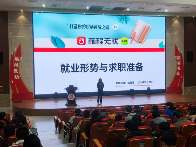 为引导学生树立正确的就业观和职业观,做好职业生涯规划,明确求职方向。3月21日,WilliamHill官方网站组织开展了“走近职场”系列活动之《大学生就业与创业实务》课程解读专题会暨《就业形势分析与求职准备》讲座,邀请前程无忧职场导师沈雪琴开展讲座,2021级辅导员赵玉伟、2021级全体本科生以及2024届毕业生300余名学生参会,会议由辅导员高汕主持。