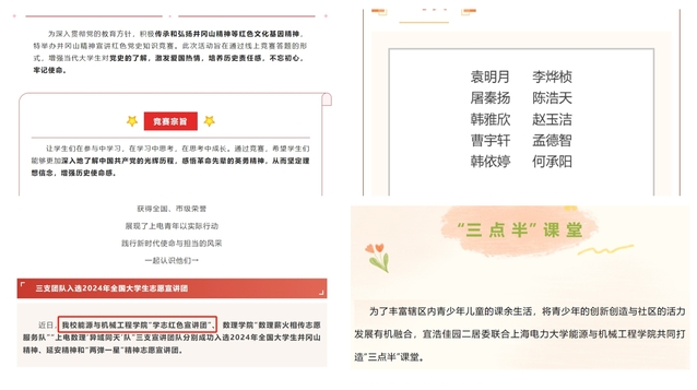 团队自入选以来,得到校团委、院党委及团委的大力支持,“星火之炬传承井冈山精神,点亮新时代理想光芒”为主题,开展20余场次宣讲活动,10余种活动形式,覆盖团支部、班级、社团、园区、社区、中小学等近2000余人次,受到校内外推送宣传15次,产生了良好的宣传效果,受到校内外师生一致好评。在此过程中,宣讲团逐渐形成了“以学铸魂,以干践行,学思践悟”的总方针,以点带面,纵深发力,让井冈山精神绽放出跨越时空的耀眼光芒。