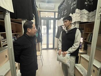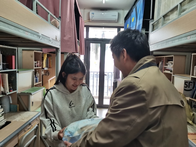 在学生宿舍内,潘卫国亲切询问新生对大学新环境的适应情况和3个月以来的学习状况,同学们纷纷回应自己在校的学习和生活情况,并表示已基本适应在大学生活。潘卫国叮嘱同学们寒冬来临要注意保暖,并送上学院为大家准备的毛毯。在询问同学们家中情况的同时,鼓励大家勇敢面对生活中的困难,把暂时的困境当作成长的磨砺,学院将永远是大家最大的支持和保障。